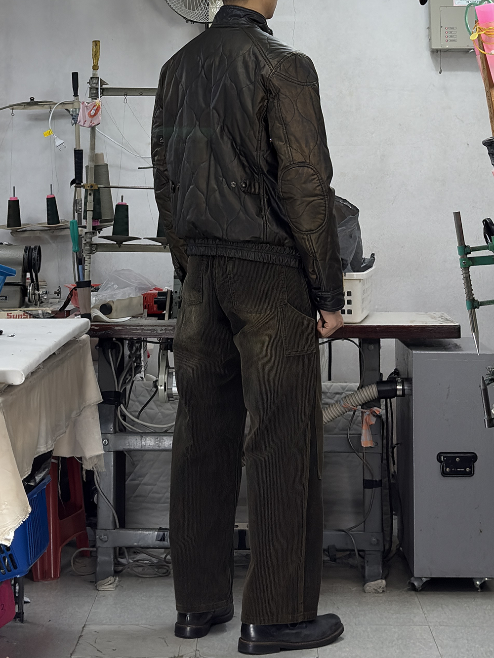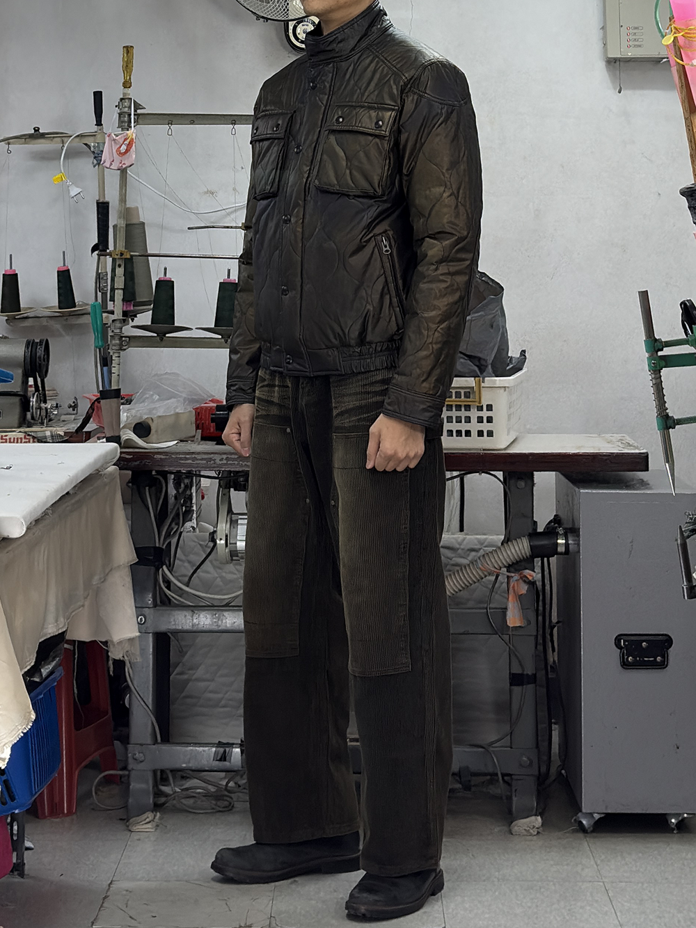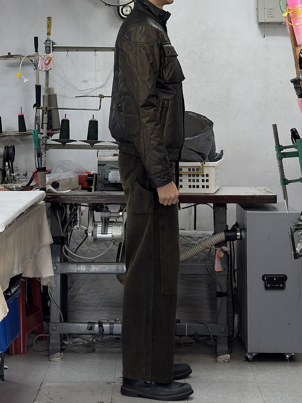 · '차이나 카라, 플랩 포켓 덮개, 커프스의 안쪽'을 골덴 원단으로 배색 처리