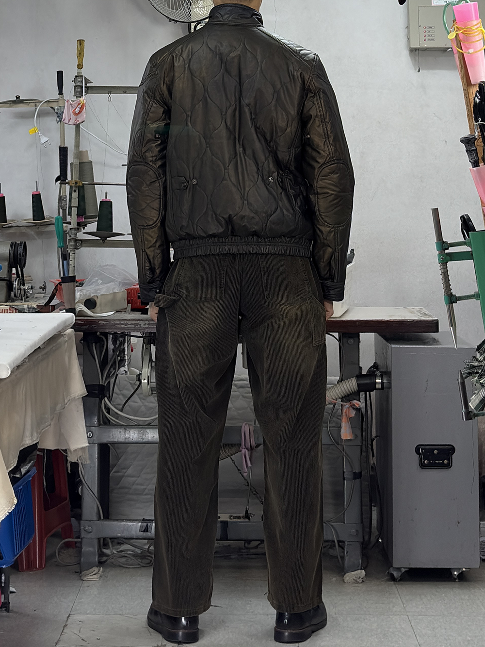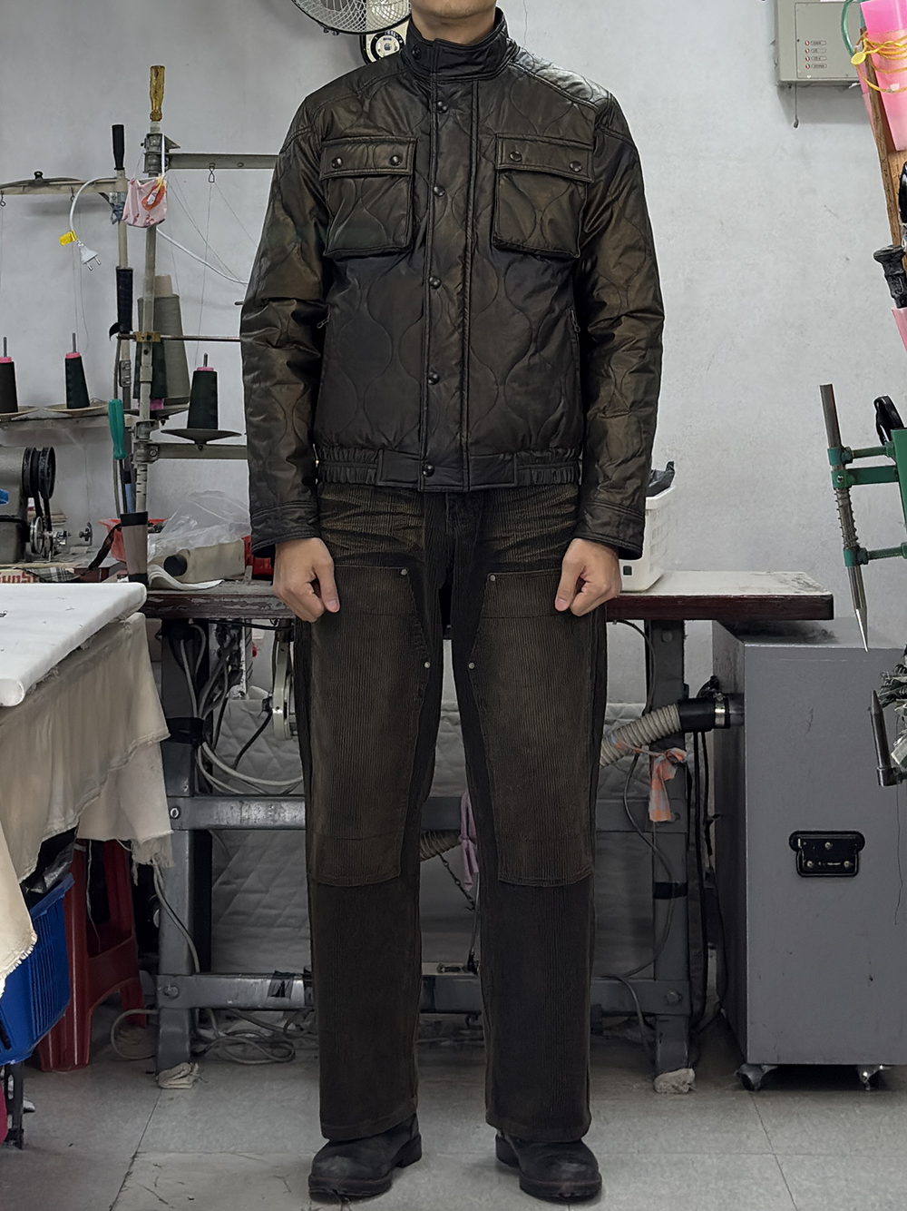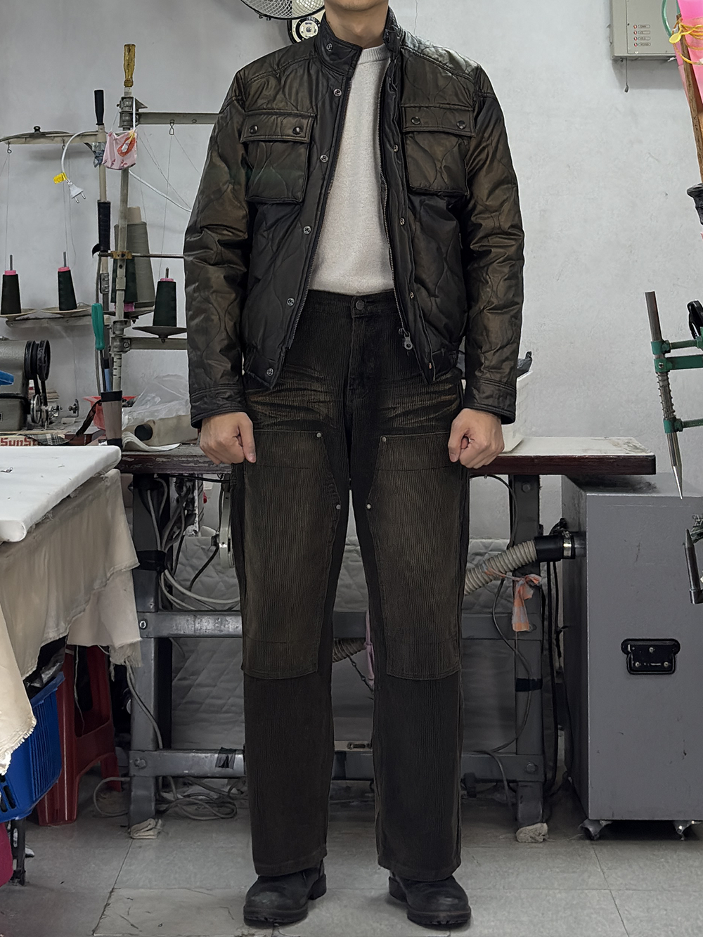 · '차이나 카라, 플랩 포켓 덮개, 커프스의 안쪽'을 골덴 원단으로 배색 처리