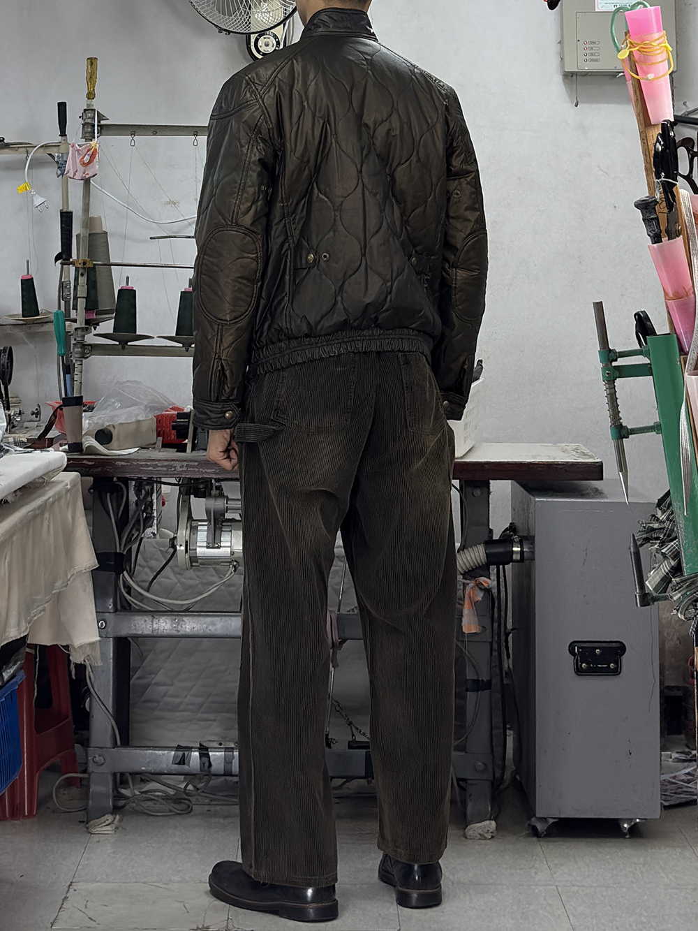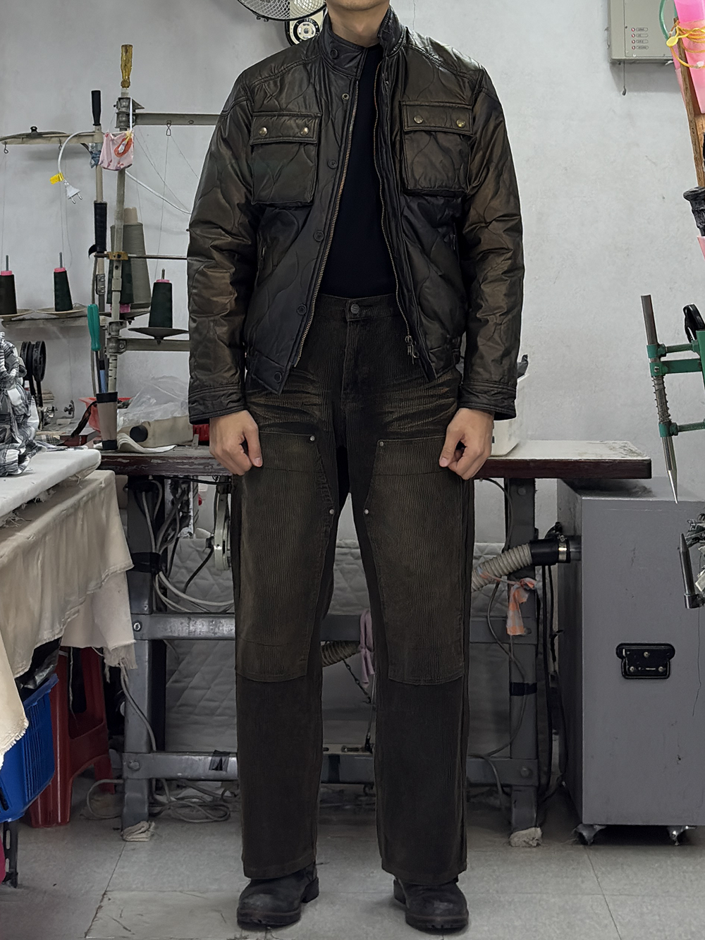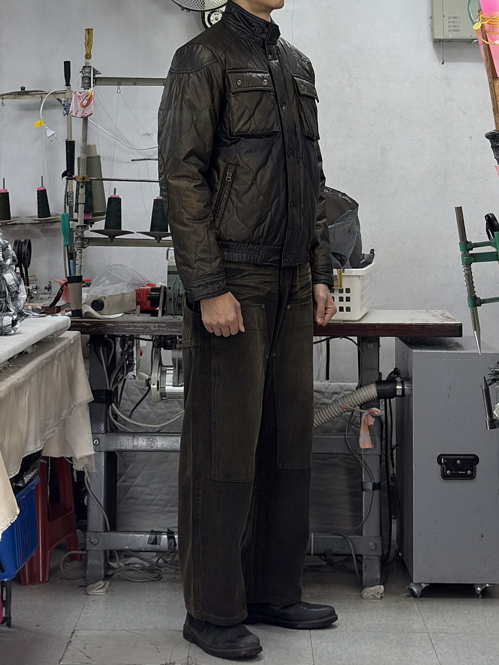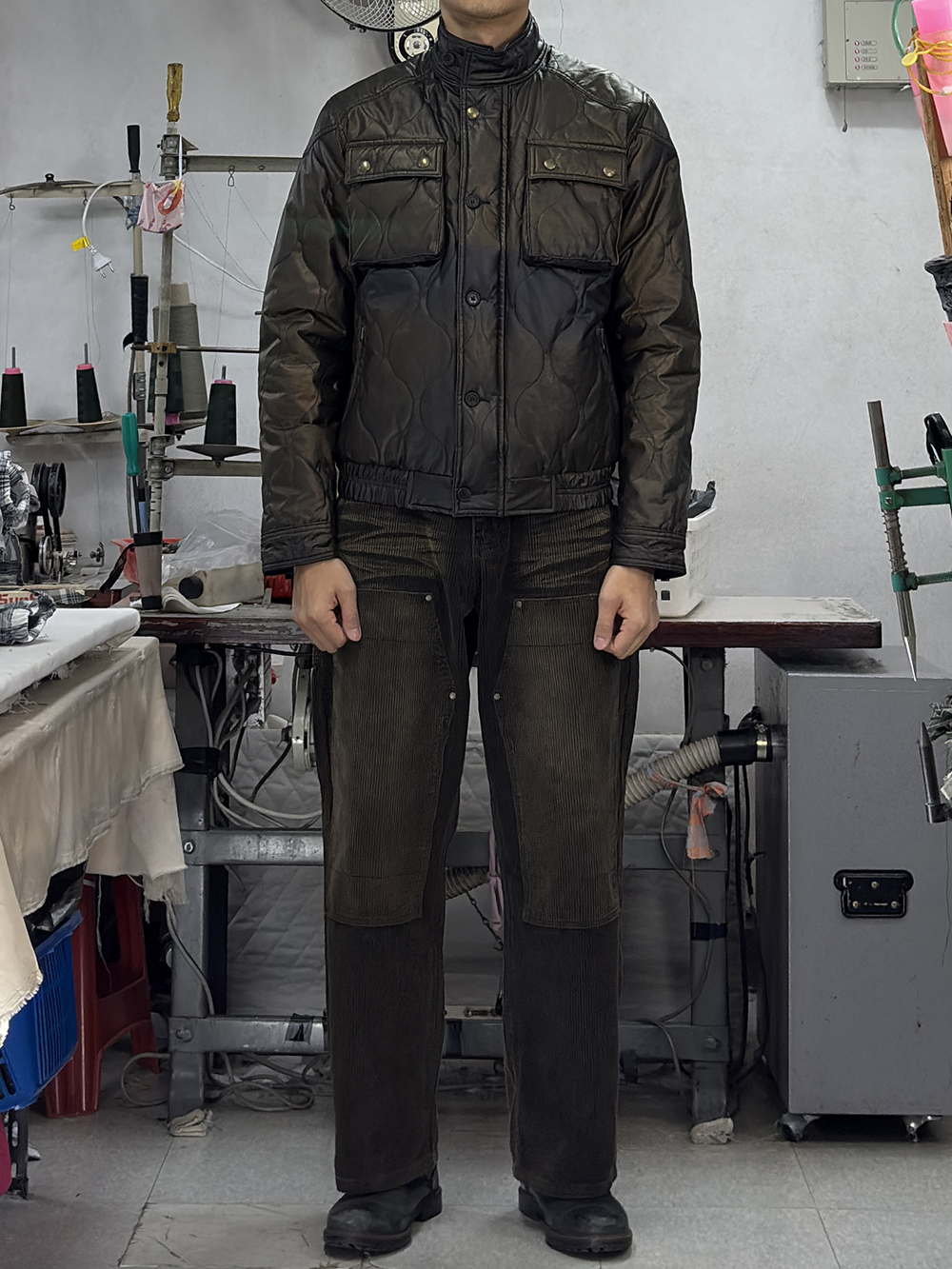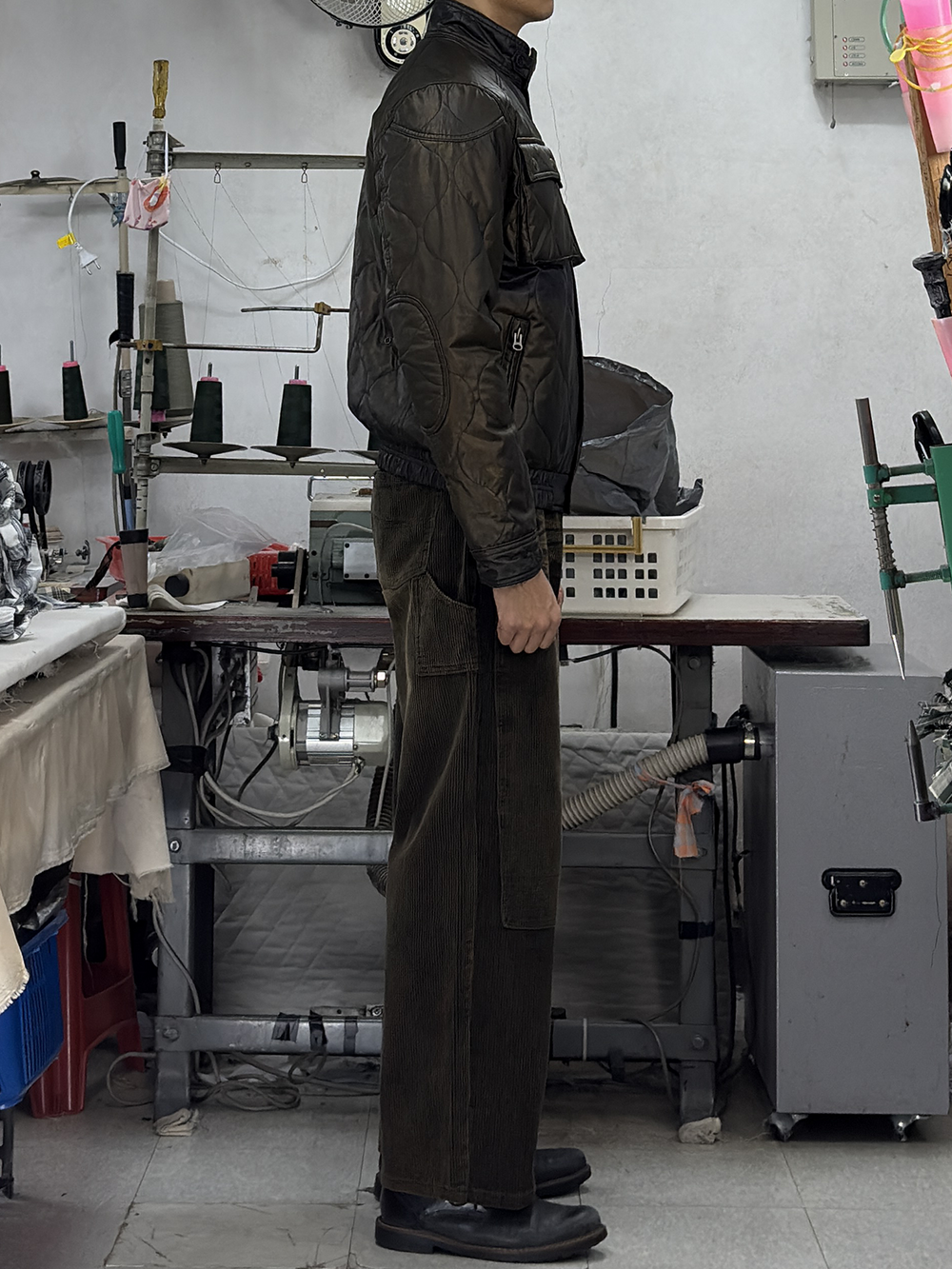 · '차이나 카라, 플랩 포켓 덮개, 커프스의 안쪽'을 골덴 원단으로 배색 처리