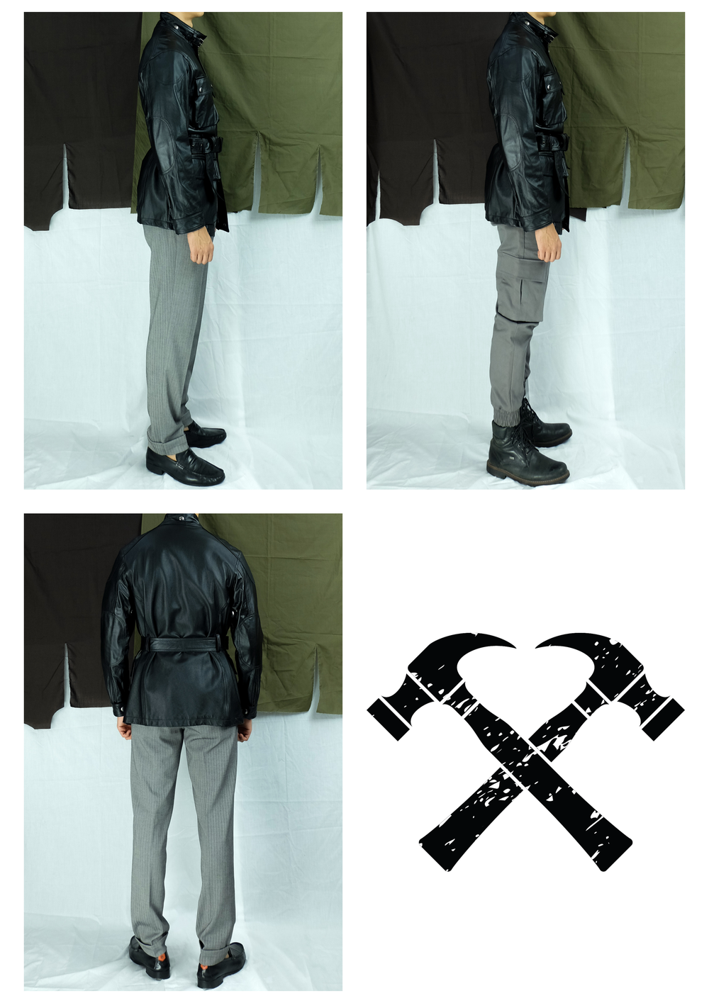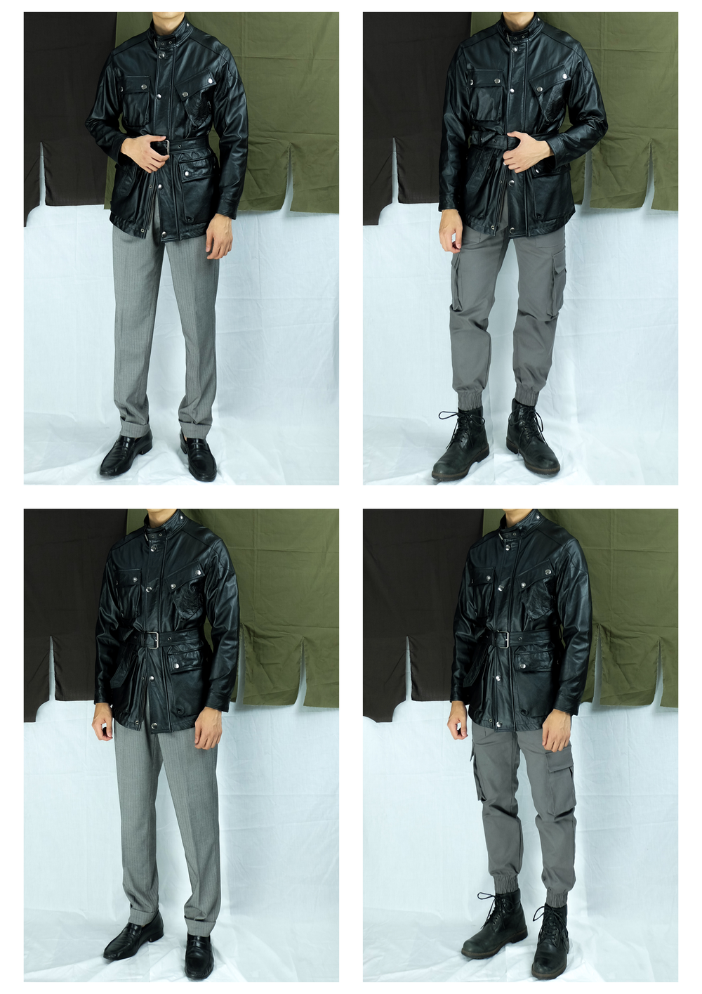· '플라켓, 차이나 카라, 플랩 포켓 덮개, 커프스의 안쪽'을 골덴 원단으로 배색 처리