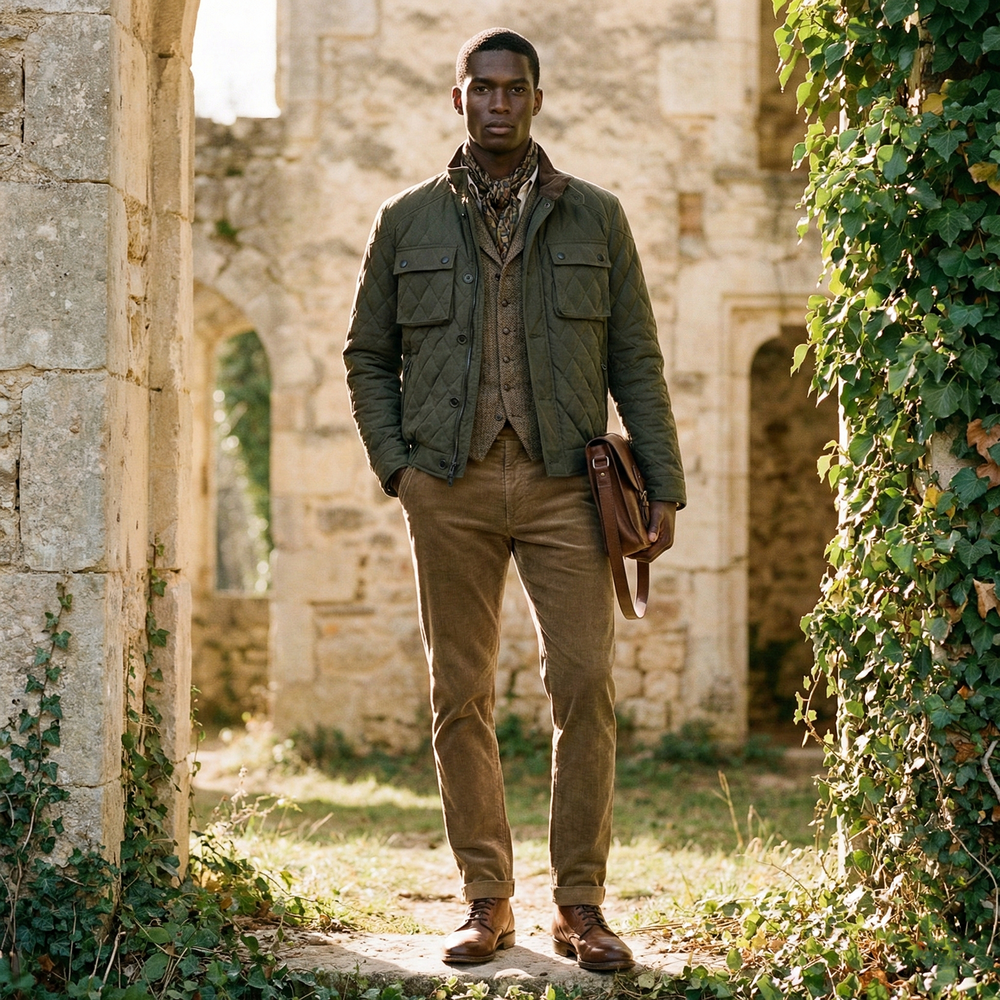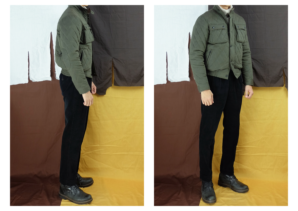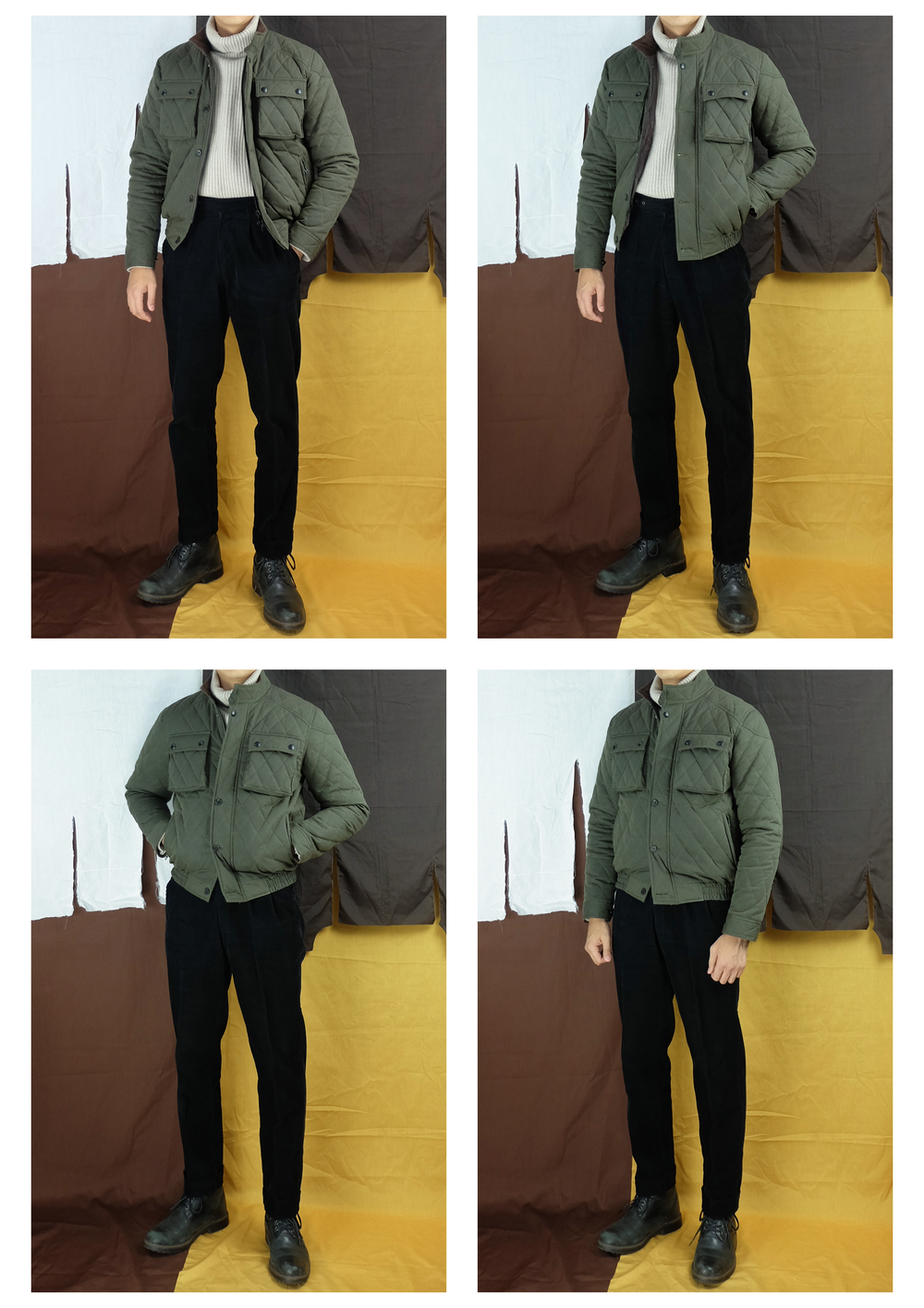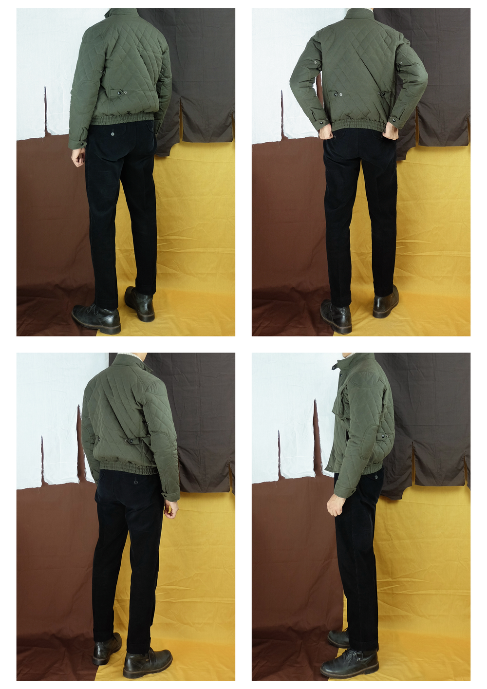 · '차이나 카라, 플랩 포켓 덮개, 커프스의 안쪽'을 골덴 원단으로 배색 처리