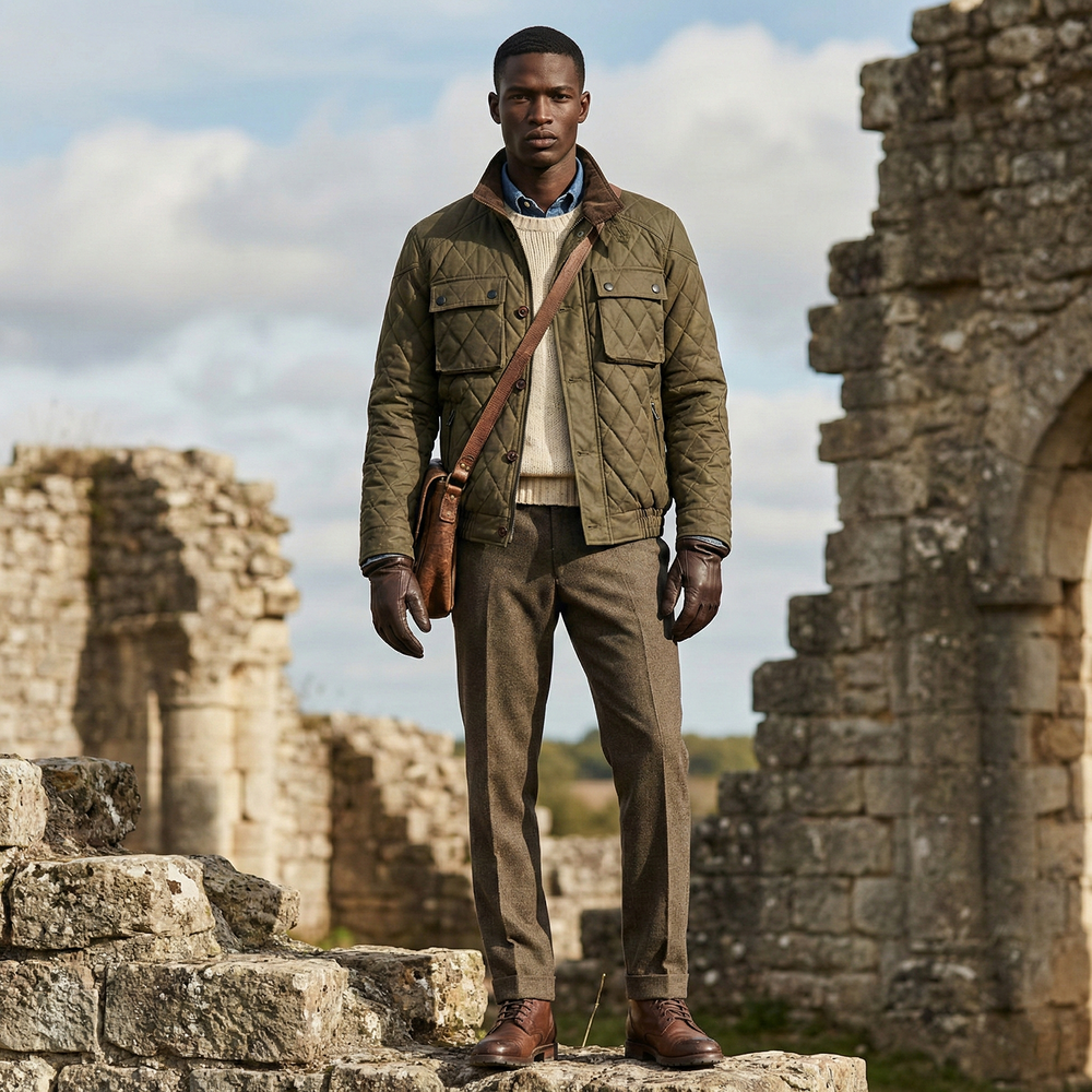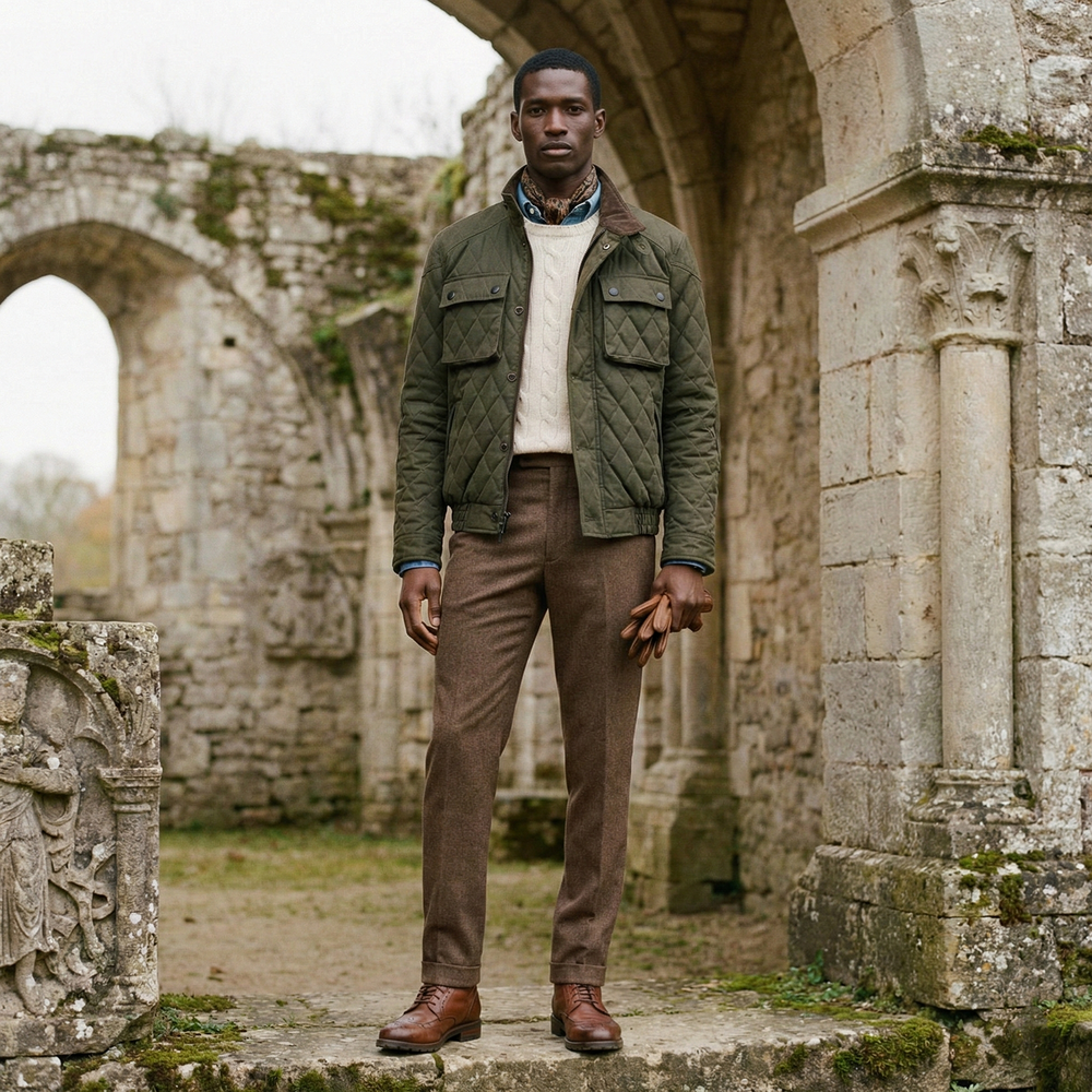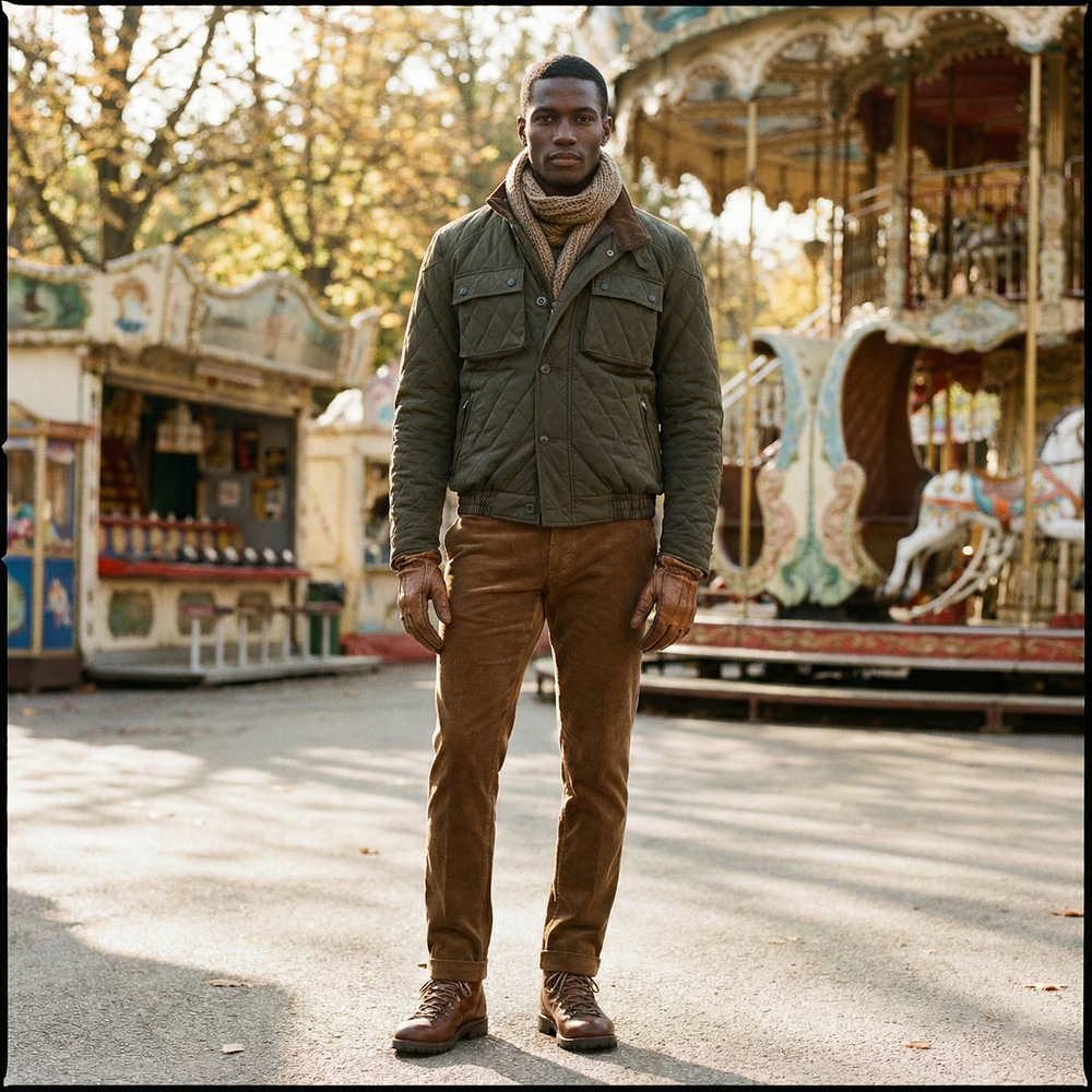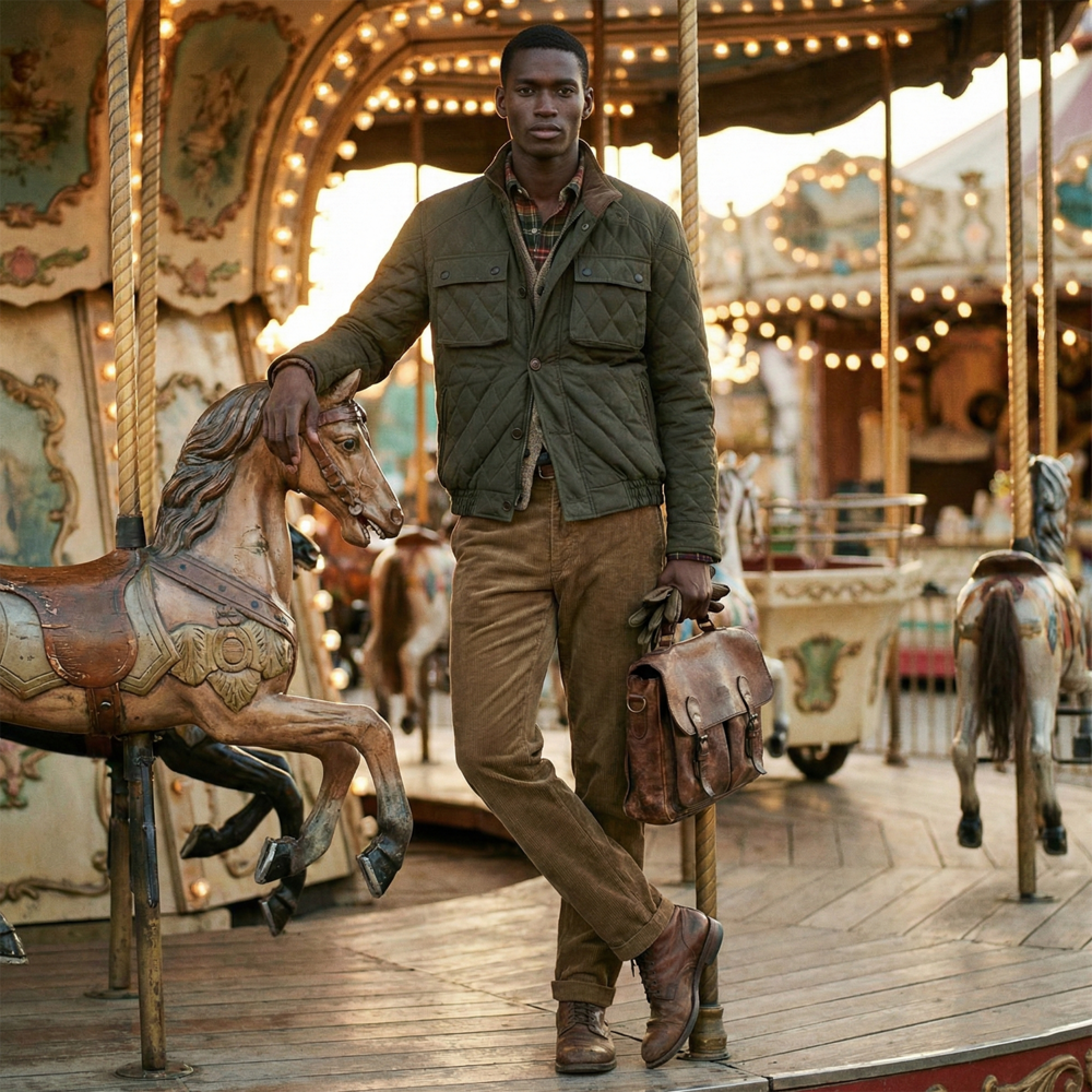 · '차이나 카라, 플랩 포켓 덮개, 커프스의 안쪽'을 골덴 원단으로 배색 처리