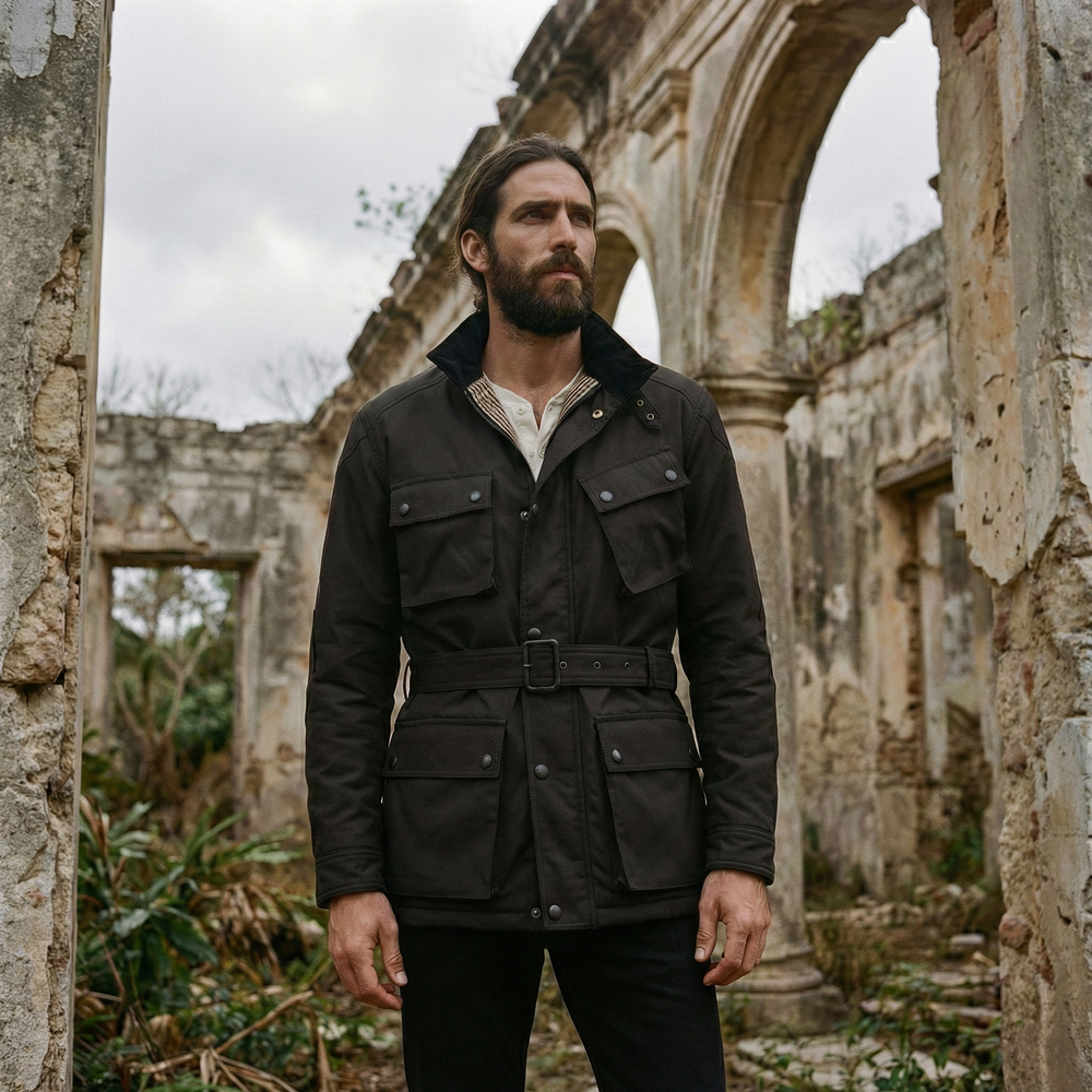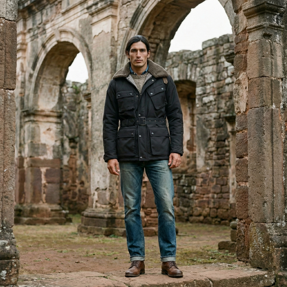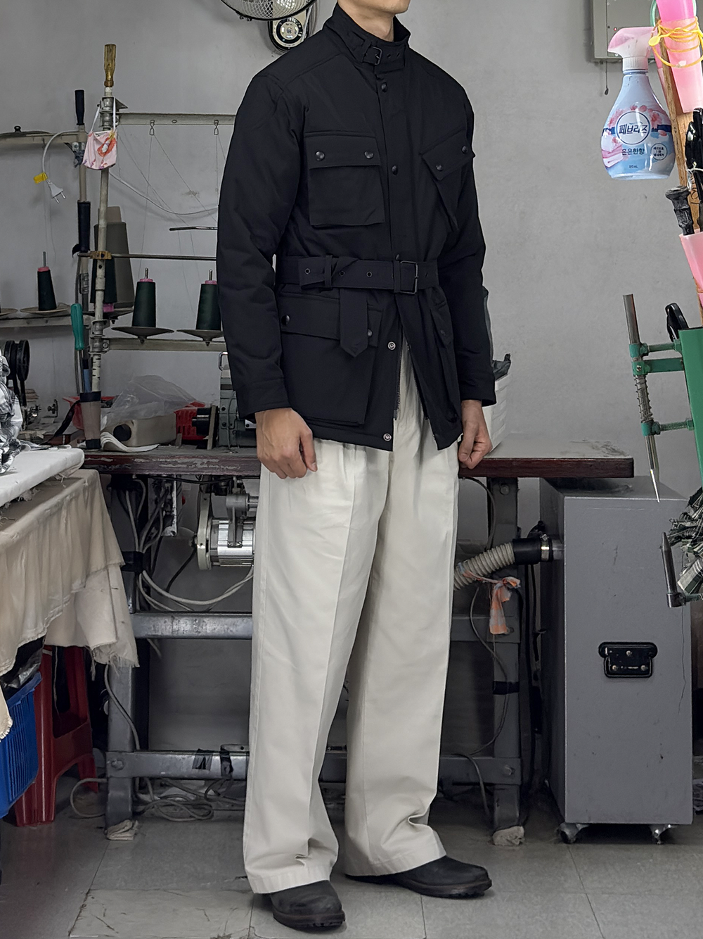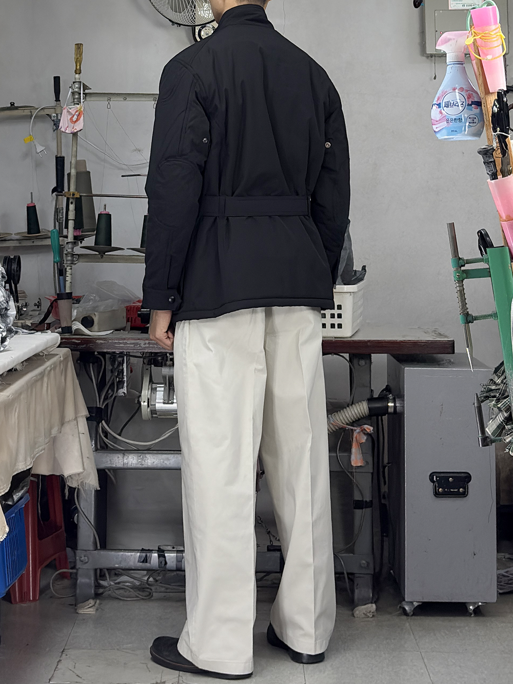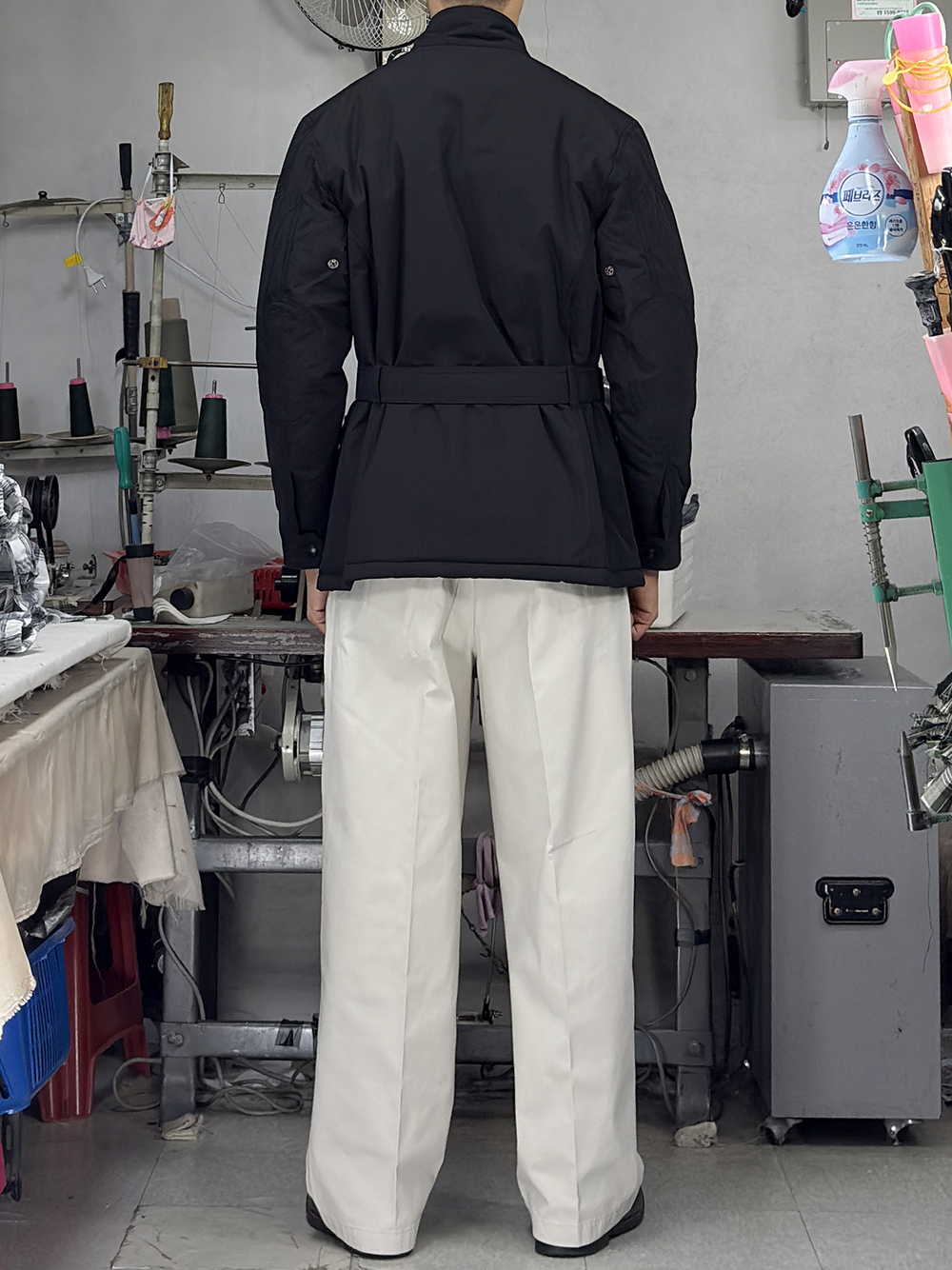 · '차이나 카라, 플랩 포켓 덮개, 커프스의 안쪽'을 골덴 원단으로 배색 처리