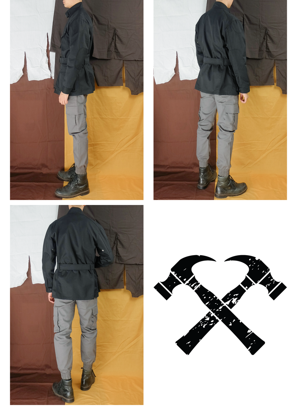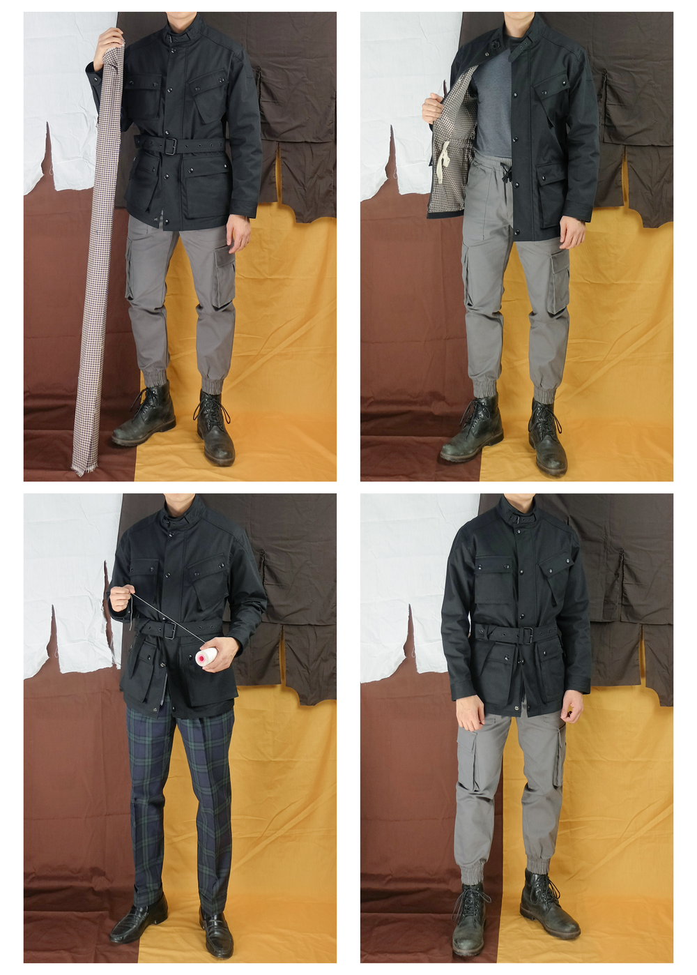 · '차이나 카라, 플랩 포켓 덮개, 커프스의 안쪽'을 골덴 원단으로 배색 처리